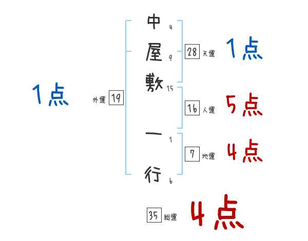 人運![]() | 中屋敷一行さんの人運は16画の5つ星!人望が厚く大きく発展する。逆転成功が見える。 性格や才能などを表す2番目に重要な運勢です。人間関係や協調性、社会的な成功に影響します。主に20歳から50歳ぐらいまでの中年期の運勢を表します。 |