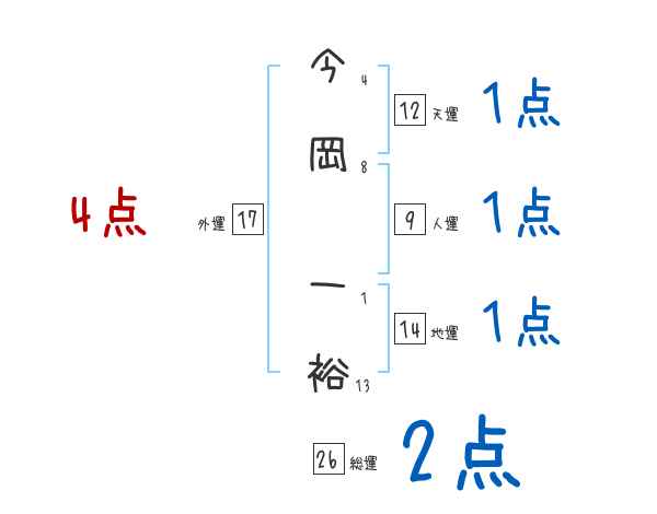 外運![]() | 今岡一裕さんの外運は17画の4つ星!積極的な行動力。地位を気づき財産を手に入れる。純粋な心と直感力。 生活面を象徴する運勢です。外部から受ける影響力を表し、結婚運、家庭運や職場、環境への順応性を表します。 |