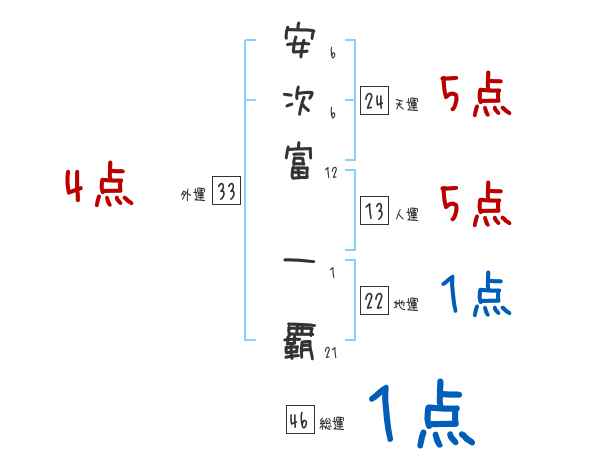 天運![]() | 安次富一覇さんの天運は24画の5つ星!家庭運が良く順調な人生。金運にも恵まれる。 家系が持つ宿命的な運勢を表します。祖先から受け継いだ苗字ですので自分の力が及びません。家柄を象徴します。 |