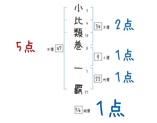 外運![]() | 小比類巻一覇さんの外運は47画の5つ星!実力が開花し発展する円満な人生。財に恵まれる。 生活面を象徴する運勢です。外部から受ける影響力を表し、結婚運、家庭運や職場、環境への順応性を表します。 |