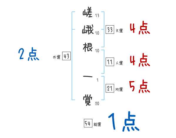総運![]() | 嵯峨根一覚さんの総運は54画の1つ星!トラブルが多いかも。周りをよく見て協調して過ごしましょう。 あなたの人生を表す1番重要な運勢です。生涯を通じて影響する総合運となり、主に50歳以降の晩年期に影響を及ぼします。 |