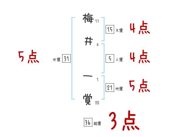 総運![]() | 梅井一覚さんの総運は36画の3つ星!先見性が豊かです。多少神経質で苦労することも。 あなたの人生を表す1番重要な運勢です。生涯を通じて影響する総合運となり、主に50歳以降の晩年期に影響を及ぼします。 |