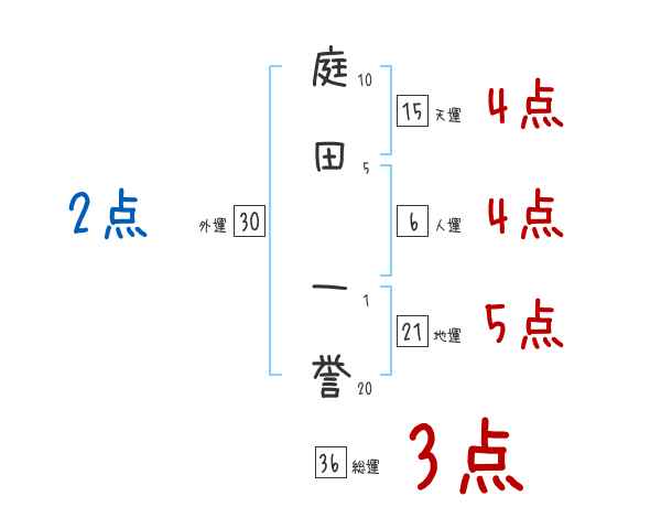 総運![]() | 庭田一誉さんの総運は36画の3つ星!先見性が豊かです。多少神経質で苦労することも。 あなたの人生を表す1番重要な運勢です。生涯を通じて影響する総合運となり、主に50歳以降の晩年期に影響を及ぼします。 |