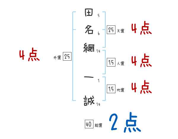 天運![]() | 田名網一誠さんの天運は25画の4つ星!個性があり才能があふれる。強運の持ち主で発展する。 家系が持つ宿命的な運勢を表します。祖先から受け継いだ苗字ですので自分の力が及びません。家柄を象徴します。 |