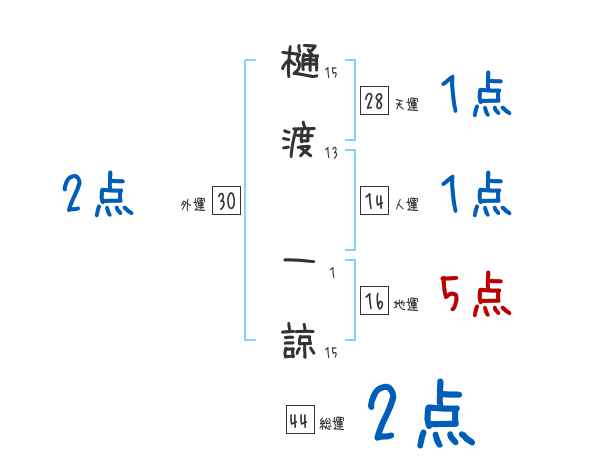 総運![]() | 樋渡一諒さんの総運は44画の2つ星!誠実で慎重な性格。物事を考えすぎないように注意しましょう。 あなたの人生を表す1番重要な運勢です。生涯を通じて影響する総合運となり、主に50歳以降の晩年期に影響を及ぼします。 |