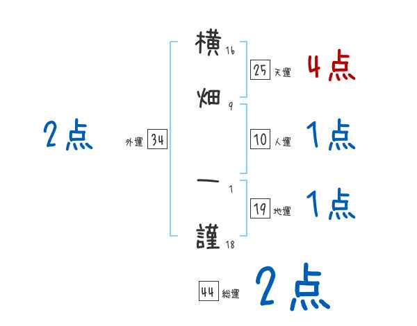 総運![]() | 横畑一謹さんの総運は44画の2つ星!誠実で慎重な性格。物事を考えすぎないように注意しましょう。 あなたの人生を表す1番重要な運勢です。生涯を通じて影響する総合運となり、主に50歳以降の晩年期に影響を及ぼします。 |