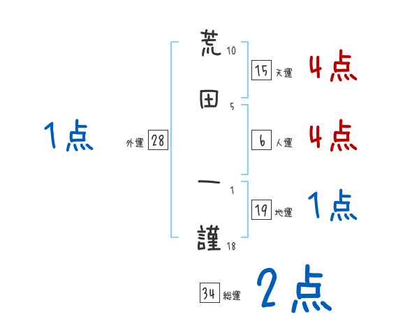 総運![]() | 荒田一謹さんの総運は34画の2つ星!独創性に優れるが、自尊心が強く災難に注意しましょう。 あなたの人生を表す1番重要な運勢です。生涯を通じて影響する総合運となり、主に50歳以降の晩年期に影響を及ぼします。 |