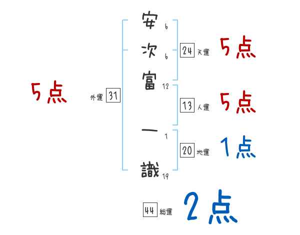 地運![]() | 安次富一識さんの地運は20画の1つ星!社交が苦手。人とは違った才能があり波乱万丈な人生かも。 個性を表す基礎的な運勢です。性格形成や対人関係、行動力など家庭環境に影響されます。主に誕生してから20歳くらいまでの若年期の運勢を表します。 |