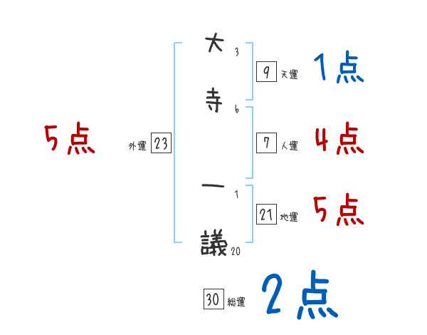人運![]() | 大寺一議さんの人運は7画の4つ星!強い意志や信念を持ち独立心が強い。自立する。 性格や才能などを表す2番目に重要な運勢です。人間関係や協調性、社会的な成功に影響します。主に20歳から50歳ぐらいまでの中年期の運勢を表します。 |