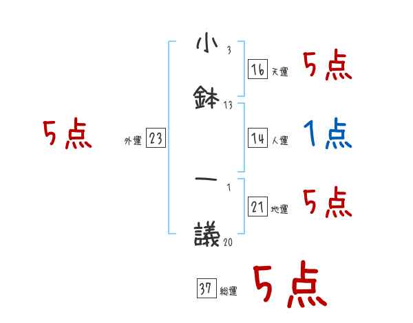 外運![]() | 小鉢一議さんの外運は23画の5つ星!想像力に優れ活力がある。一代で成功し名誉を手に入れる。 生活面を象徴する運勢です。外部から受ける影響力を表し、結婚運、家庭運や職場、環境への順応性を表します。 |