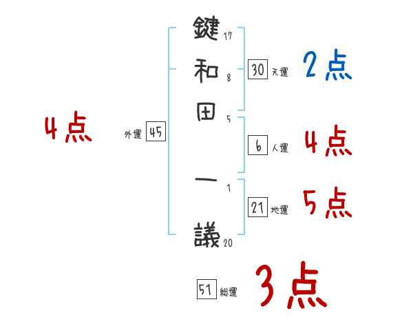 天運![]() | 鍵和田一議さんの天運は30画の2つ星!浮き沈みの激しさに注意しましょう。 家系が持つ宿命的な運勢を表します。祖先から受け継いだ苗字ですので自分の力が及びません。家柄を象徴します。 |