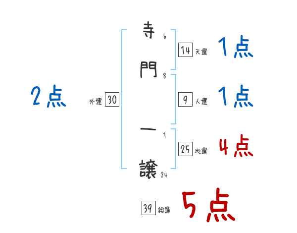 総運![]() | 寺門一譲さんの総運は39画の5つ星!社交性に優れ人望が厚い。人の上に立ち成功する。 あなたの人生を表す1番重要な運勢です。生涯を通じて影響する総合運となり、主に50歳以降の晩年期に影響を及ぼします。 |
