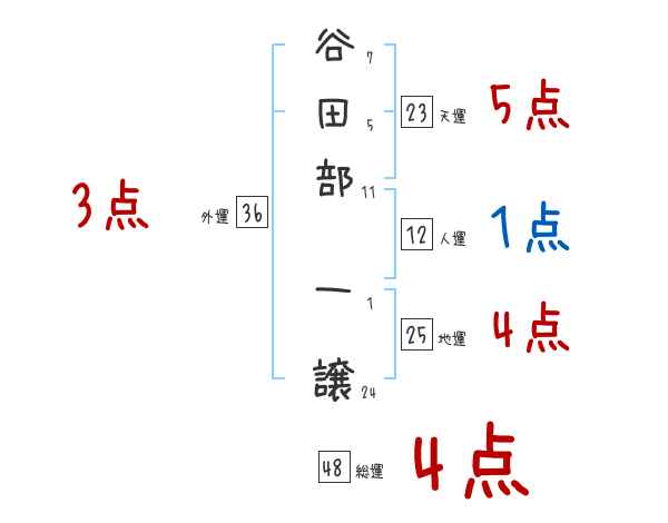 天運![]() | 谷田部一譲さんの天運は23画の5つ星!想像力に優れ活力がある。一代で成功し名誉を手に入れる。 家系が持つ宿命的な運勢を表します。祖先から受け継いだ苗字ですので自分の力が及びません。家柄を象徴します。 |