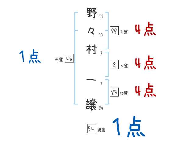 天運![]() | 野々村一譲さんの天運は29画の4つ星!完全主義で才能がある。厳格な心の持ち主。 家系が持つ宿命的な運勢を表します。祖先から受け継いだ苗字ですので自分の力が及びません。家柄を象徴します。 |