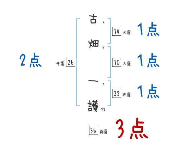 総運![]() | 古畑一護さんの総運は36画の3つ星!先見性が豊かです。多少神経質で苦労することも。 あなたの人生を表す1番重要な運勢です。生涯を通じて影響する総合運となり、主に50歳以降の晩年期に影響を及ぼします。 |