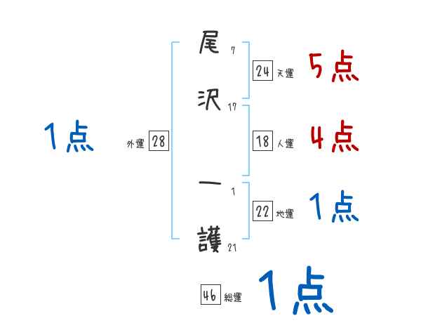 天運![]() | 尾沢一護さんの天運は24画の5つ星!家庭運が良く順調な人生。金運にも恵まれる。 家系が持つ宿命的な運勢を表します。祖先から受け継いだ苗字ですので自分の力が及びません。家柄を象徴します。 |