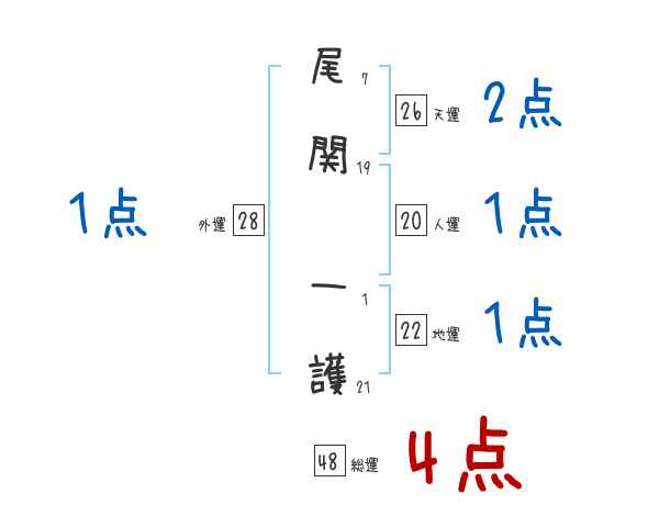 天運![]() | 尾関一護さんの天運は26画の2つ星!波瀾万丈かも。信頼できる人を大事にしましょう。 家系が持つ宿命的な運勢を表します。祖先から受け継いだ苗字ですので自分の力が及びません。家柄を象徴します。 |