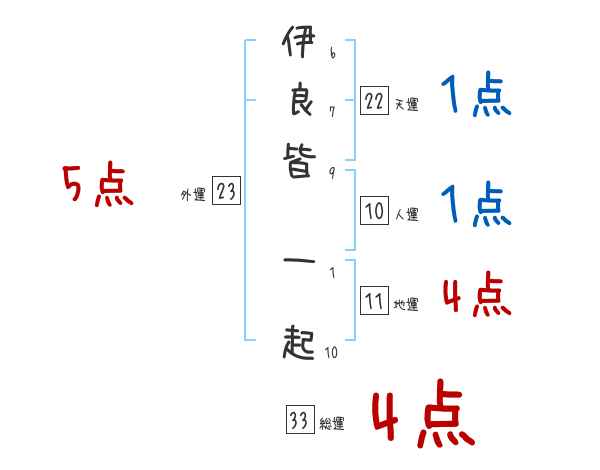 天運![]() | 伊良皆一起さんの天運は22画の1つ星!努力することが苦手ないっぽう手先が器用。芸術性にも優れる。 家系が持つ宿命的な運勢を表します。祖先から受け継いだ苗字ですので自分の力が及びません。家柄を象徴します。 |