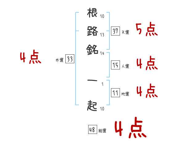 天運![]() | 根路銘一起さんの天運は37画の5つ星!努力家で順応性に優れる。現実的な考え方ができ忠実に物事をこなす。 家系が持つ宿命的な運勢を表します。祖先から受け継いだ苗字ですので自分の力が及びません。家柄を象徴します。 |