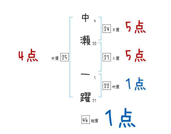 天運![]() | 中瀬一躍さんの天運は24画の5つ星!家庭運が良く順調な人生。金運にも恵まれる。 家系が持つ宿命的な運勢を表します。祖先から受け継いだ苗字ですので自分の力が及びません。家柄を象徴します。 |