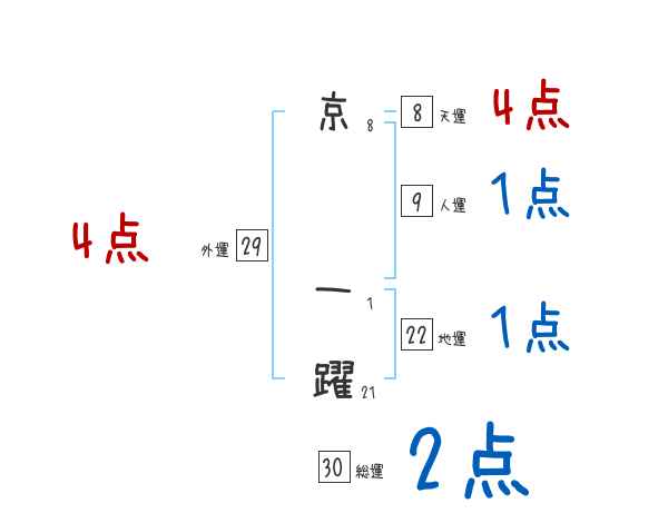 外運![]() | 京一躍さんの外運は29画の4つ星!完全主義で才能がある。厳格な心の持ち主。 生活面を象徴する運勢です。外部から受ける影響力を表し、結婚運、家庭運や職場、環境への順応性を表します。 |