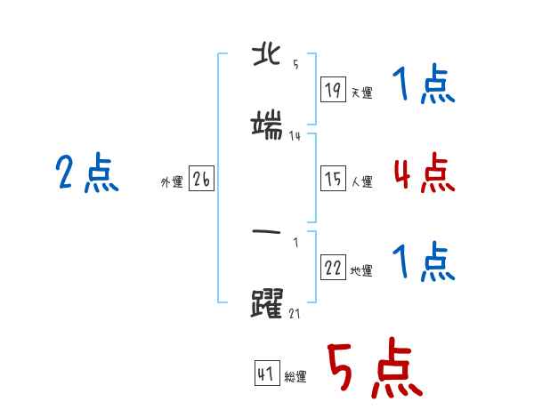 天運![]() | 北端一躍さんの天運は19画の1つ星!優れた才能を持ちますが、協調性が足りないことも。周りの人と協力する事を意識しましょう。 家系が持つ宿命的な運勢を表します。祖先から受け継いだ苗字ですので自分の力が及びません。家柄を象徴します。 |