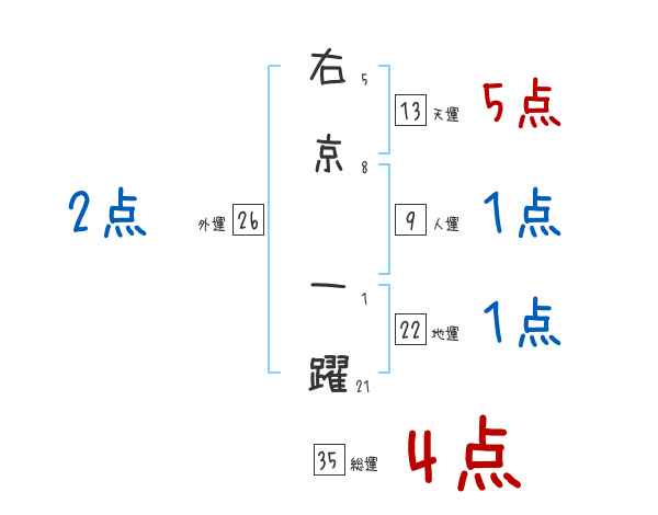 天運![]() | 右京一躍さんの天運は13画の5つ星!才能に恵まれ人気がある。名声を手に入れる。円満な人生。 家系が持つ宿命的な運勢を表します。祖先から受け継いだ苗字ですので自分の力が及びません。家柄を象徴します。 |