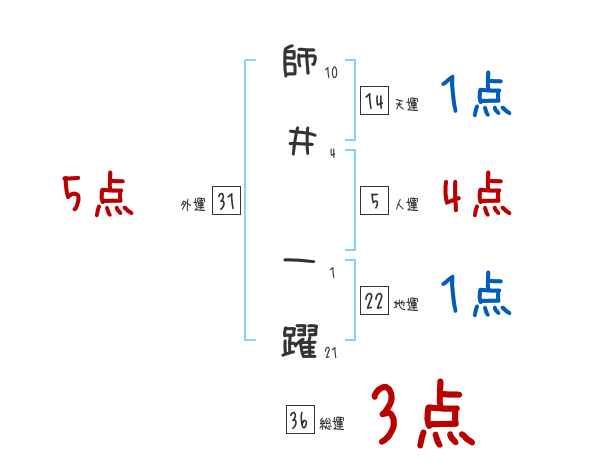 人運![]() | 師井一躍さんの人運は5画の4つ星!健康で安泰。協調性に優れ、財産に恵まれる。 性格や才能などを表す2番目に重要な運勢です。人間関係や協調性、社会的な成功に影響します。主に20歳から50歳ぐらいまでの中年期の運勢を表します。 |