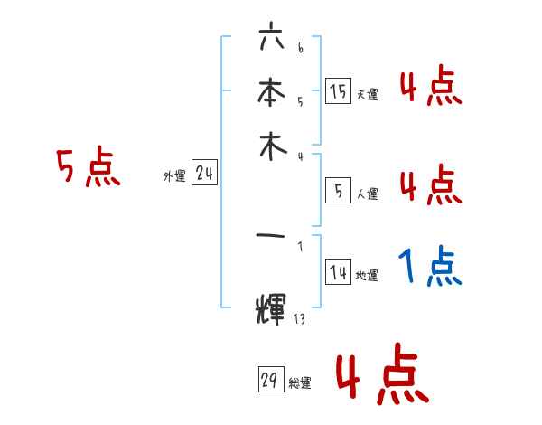 外運![]() | 六本木一輝さんの外運は24画の5つ星!家庭運が良く順調な人生。金運にも恵まれる。 生活面を象徴する運勢です。外部から受ける影響力を表し、結婚運、家庭運や職場、環境への順応性を表します。 |