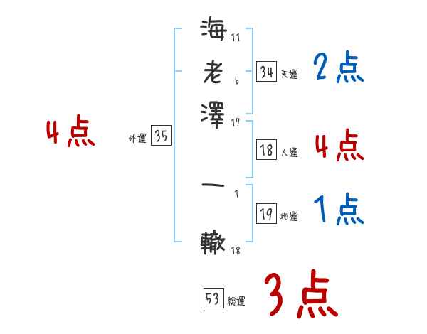 外運![]() | 海老澤一轍さんの外運は35画の4つ星!温厚な性格で感受性が高い。穏和な性格で人望が厚い。 生活面を象徴する運勢です。外部から受ける影響力を表し、結婚運、家庭運や職場、環境への順応性を表します。 |