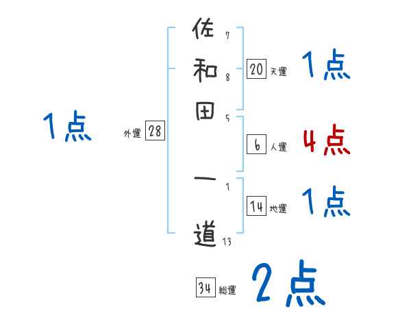 外運![]() | 佐和田一道さんの外運は28画の1つ星!家庭環境に注意。スポーツで活躍できる能力があるかも。 生活面を象徴する運勢です。外部から受ける影響力を表し、結婚運、家庭運や職場、環境への順応性を表します。 |