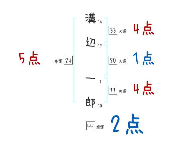 総運![]() | 溝辺一郎さんの総運は44画の2つ星!誠実で慎重な性格。物事を考えすぎないように注意しましょう。 あなたの人生を表す1番重要な運勢です。生涯を通じて影響する総合運となり、主に50歳以降の晩年期に影響を及ぼします。 |