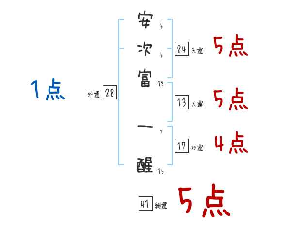 人運![]() | 安次富一醒さんの人運は13画の5つ星!才能に恵まれ人気がある。名声を手に入れる。円満な人生。 性格や才能などを表す2番目に重要な運勢です。人間関係や協調性、社会的な成功に影響します。主に20歳から50歳ぐらいまでの中年期の運勢を表します。 |