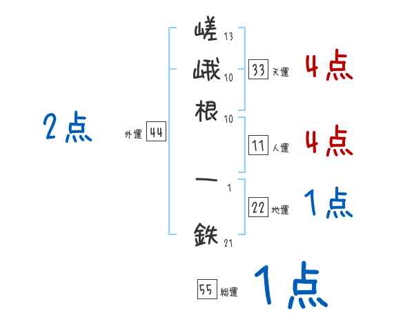 総運![]() | 嵯峨根一鉄さんの総運は55画の1つ星!欲張りな性格で軽率な行動に注意しましょう。病気に気をつけて。 あなたの人生を表す1番重要な運勢です。生涯を通じて影響する総合運となり、主に50歳以降の晩年期に影響を及ぼします。 |