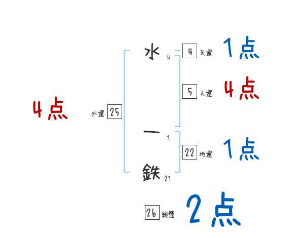 天運![]() | 水一鉄さんの天運は4画の1つ星!感情が不安定で苦労するかも。周囲との協調を心掛けましょう。 家系が持つ宿命的な運勢を表します。祖先から受け継いだ苗字ですので自分の力が及びません。家柄を象徴します。 |