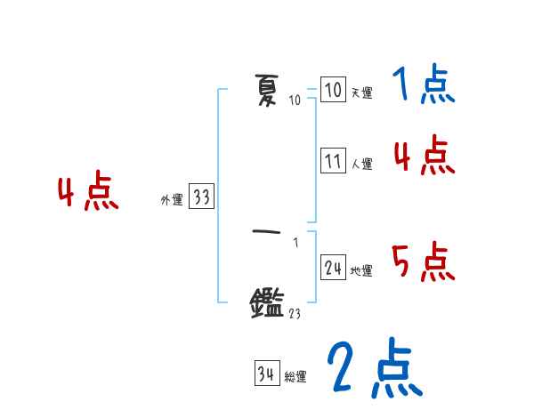 総運![]() | 夏一鑑さんの総運は34画の2つ星!独創性に優れるが、自尊心が強く災難に注意しましょう。 あなたの人生を表す1番重要な運勢です。生涯を通じて影響する総合運となり、主に50歳以降の晩年期に影響を及ぼします。 |