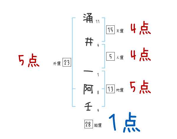 人運![]() | 涌井一阿壬さんの人運は5画の4つ星!健康で安泰。協調性に優れ、財産に恵まれる。 性格や才能などを表す2番目に重要な運勢です。人間関係や協調性、社会的な成功に影響します。主に20歳から50歳ぐらいまでの中年期の運勢を表します。 |