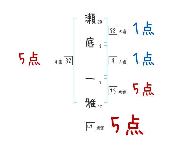外運![]() | 瀬底一雅さんの外運は32画の5つ星!柔軟性があり成功する。チャンスが多く金運が良い。 生活面を象徴する運勢です。外部から受ける影響力を表し、結婚運、家庭運や職場、環境への順応性を表します。 |