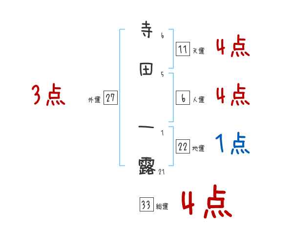 天運![]() | 寺田一露さんの天運は11画の4つ星!着実に富や地位を得る幸運な人生。 家系が持つ宿命的な運勢を表します。祖先から受け継いだ苗字ですので自分の力が及びません。家柄を象徴します。 |