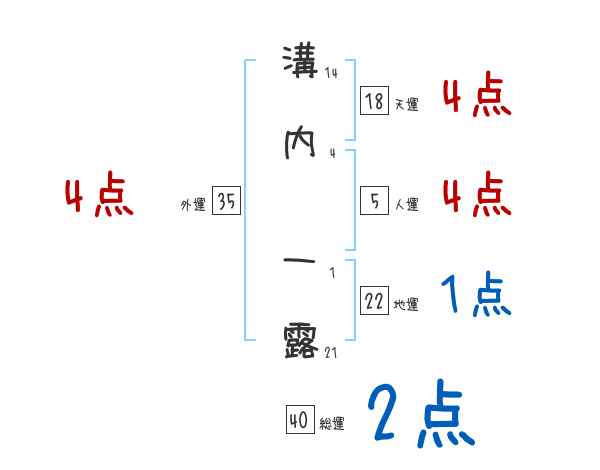 天運![]() | 溝内一露さんの天運は18画の4つ星!情熱的で剛気。忍耐力があり信頼される。 家系が持つ宿命的な運勢を表します。祖先から受け継いだ苗字ですので自分の力が及びません。家柄を象徴します。 |