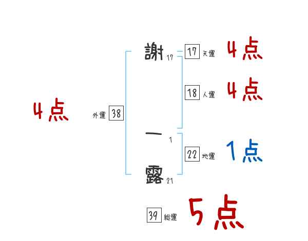 総運![]() | 謝一露さんの総運は39画の5つ星!社交性に優れ人望が厚い。人の上に立ち成功する。 あなたの人生を表す1番重要な運勢です。生涯を通じて影響する総合運となり、主に50歳以降の晩年期に影響を及ぼします。 |