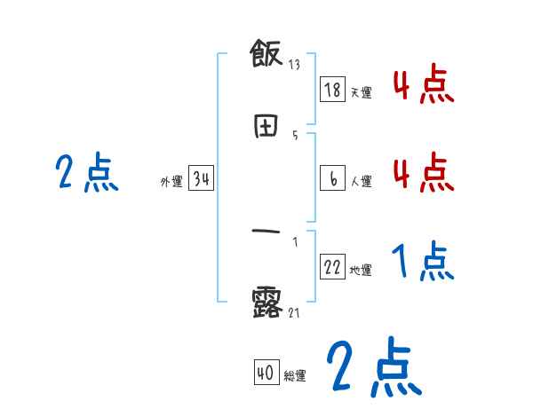 天運![]() | 飯田一露さんの天運は18画の4つ星!情熱的で剛気。忍耐力があり信頼される。 家系が持つ宿命的な運勢を表します。祖先から受け継いだ苗字ですので自分の力が及びません。家柄を象徴します。 |