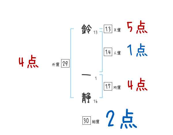 外運![]() | 鈴一静さんの外運は29画の4つ星!完全主義で才能がある。厳格な心の持ち主。 生活面を象徴する運勢です。外部から受ける影響力を表し、結婚運、家庭運や職場、環境への順応性を表します。 |