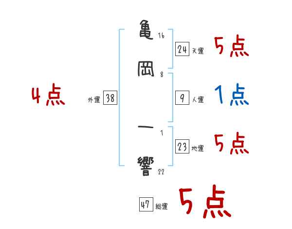 外運![]() | 亀岡一響さんの外運は38画の4つ星!温厚な性格で技術的な才能を発揮する。職人的な仕事に向いている。 生活面を象徴する運勢です。外部から受ける影響力を表し、結婚運、家庭運や職場、環境への順応性を表します。 |