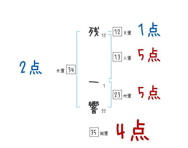 天運![]() | 残一響さんの天運は12画の1つ星!簡単な失敗で諦めてしまいやすいかも。着実に行動すると良いでしょう。 家系が持つ宿命的な運勢を表します。祖先から受け継いだ苗字ですので自分の力が及びません。家柄を象徴します。 |