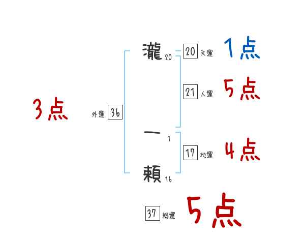 人運![]() | 瀧一頼さんの人運は21画の5つ星!統率力がある。独立し成功する。名誉を手に入れる。 性格や才能などを表す2番目に重要な運勢です。人間関係や協調性、社会的な成功に影響します。主に20歳から50歳ぐらいまでの中年期の運勢を表します。 |