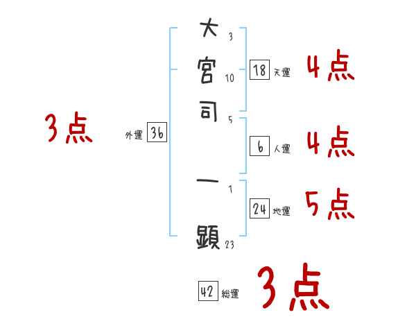 外運![]() | 大宮司一顕さんの外運は36画の3つ星!先見性が豊かです。多少神経質で苦労することも。 生活面を象徴する運勢です。外部から受ける影響力を表し、結婚運、家庭運や職場、環境への順応性を表します。 |