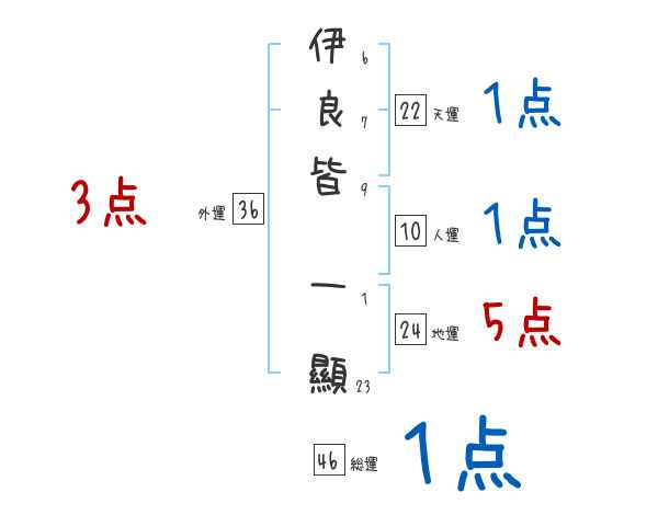 外運![]() | 伊良皆一顯さんの外運は36画の3つ星!先見性が豊かです。多少神経質で苦労することも。 生活面を象徴する運勢です。外部から受ける影響力を表し、結婚運、家庭運や職場、環境への順応性を表します。 |
