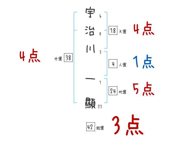 外運![]() | 宇治川一顯さんの外運は38画の4つ星!温厚な性格で技術的な才能を発揮する。職人的な仕事に向いている。 生活面を象徴する運勢です。外部から受ける影響力を表し、結婚運、家庭運や職場、環境への順応性を表します。 |