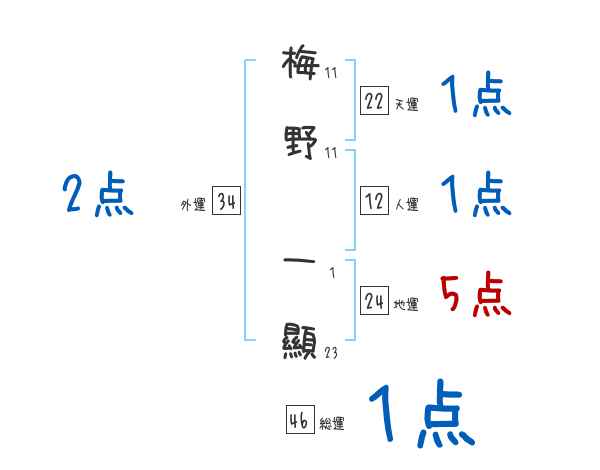 総運![]() | 梅野一顯さんの総運は46画の1つ星!迷走することが多く苦労するかも。目先のことにとらわれないように。 あなたの人生を表す1番重要な運勢です。生涯を通じて影響する総合運となり、主に50歳以降の晩年期に影響を及ぼします。 |